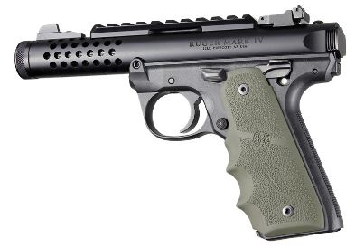 Hogue rubber grips for the Ruger 22/45 Mark IV. Finger grooves
